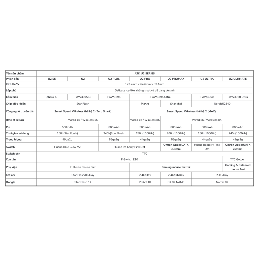 Chuột Không Dây ATK U2 Series PAW3950 Ultra 8K Rate ✅ THÔNG SỐ SẢN PHẨM Chuột gaming ATK U2 trang bị cảm biến PAW3950 / 3950 Ultra, DPI tối đa 42.000, tốc độ tracking 750IPS, gia tốc 50G, hỗ trợ polling rate 8000Hz với độ trễ trung bình chỉ 0.3993ms. Thiết kế công thái học, phù hợp palm grip & claw grip, lớp phủ Ice-Coating mát lạnh, chống trượt. Tùy chọn switch quang học hoặc Huano Ice Pink – phản hồi nhanh, click đã tay. Tối ưu cho game thủ FPS, MOBA & mọi trải nghiệm cần độ chính xác cao. ✅CHẾ ĐỘ BẢO HÀNH • Bảo hành 1 tháng, bao test 7 ngày. • Không bảo hành các trường hợp: rơi vỡ, vào nước, cháy nổ, mod phím, sạc phím bằng củ sạc điện thoại. * Lưu ý quan trọng - CHỈ SẠC BẰNG CÁCH GẮN VÀO MÁY TÍNH, KHÔNG DÙNG CỦ SẠC. - VUI LÒNG QUAY VIDEO UNNOX ĐỂ ĐƯỢC BẢO HÀNH. ✅CAM KẾT TỪ TTKEYBOARD • Hàng được kiểm tra kĩ trước khi gửi đến tay khách hàng. • Sản phầm giống hình ảnh kích thước mô tả. #ttkeyboard #chuotatk #atku2 #chuotgaming #chuot8kpollingrate #u2