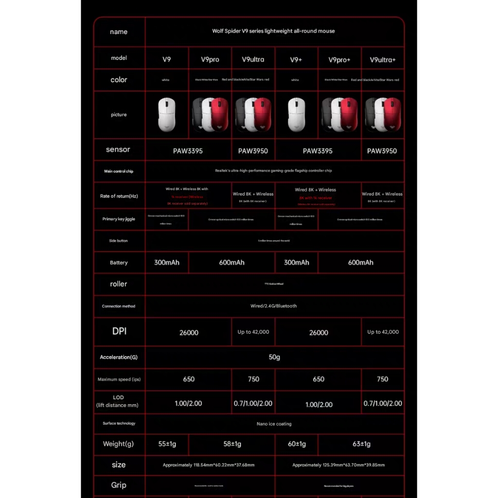Chuột Gaming Không Dây Aula V9 Series - 3 Mode Kết Nối - PAW3950 - 8K Polling rate - Đèn Nền RGB ✅THÔNG SỐ CHUNG - MCU: Realtek siêu hiệu năng - Hỗ trợ Polling rate: 8K có dây + 8K không dây. - Kết nối: Có dây / 2.4G Wireless / Bluetooth. - Tốc độ tối đa: 650 – 750 IPS (tùy sensor). - Con lăn: TTC Gold Wheel. - Bề mặt: Nano Ice Coating chống bám mồ hôi. - Đèn nền softlight RGB cực đẹp. - Trọng lượng: 55g – 65g (tùy model & kích cỡ). - Kích cỡ: - Size nhỏ V9/V9 Pro/V9 Ultra: ~118.54 × 60.22 × 37.68 mm – hợp tay nhỏ & vừa. Size lớn V9+/V9 Pro+/V9 Ultra+: ~125.39 × 63.70 × 39.85 mm – hợp tay vừa & to. ✅. V9 / V9+ - Sensor: PAW3395 – DPI tối đa 26,000. - Polling rate: 8K có dây + 1K không dây (muốn 8K wireless cần mua receiver riêng). - Switch cơ Huano. - Pin: 300mAh. - Trọng lượng: V9: 55g | V9+: 60g. ✅ V9 Pro / V9 Pro+ - Sensor: PAW3395 – DPI tối đa 26,000. - Polling rate: 8K có dây + 8K không dây (muốn 8K wireless cần mua receiver riêng). - Switch Huano quang, chống double click. - Pin: 600mAh. - Trọng lượng: V9 Pro: 58g | V9 Pro+: 63g. ✅ V9 Ultra / V9 Ultra+ - Sensor: PAW3950 – DPI tối đa 42,000. - Polling rate: 8K có dây + 8K không dây (receiver 8K tặng kèm). - Switch Huano quang , chống double-click. - Pin: 600mAh. - Trọng lượng: V9 Ultra: 60g | V9 Ultra+: 65g. https://cf.shopee.vn/file/vn-11134208-820l4-memhnmnbturqafhttps://cf.shopee.vn/file/vn-11134208-820l4-memhnmnkao05a7https://cf.shopee.vn/file/vn-11134208-820l4-memhnmnkc2kl4ahttps://cf.shopee.vn/file/vn-11134208-820l4-memhnmnkdh516b Lưu ý: ✅CHẾ ĐỘ BẢO HÀNH • Bảo hành 1 tháng, bao test 7 ngày. • Không bảo hành các trường hợp: rơi vỡ, vào nước, mod mạch, cháy nổ, sạc phím bằng củ sạc điện thoại. * Lưu ý quan trọng - CHỈ SẠC BẰNG CÁCH GẮN VÀO MÁY TÍNH, KHÔNG DÙNG CỦ SẠC. - VUI LÒNG QUAY VIDEO UNNOX ĐỂ ĐƯỢC BẢO HÀNH. ✅CAM KẾT TỪ TTKEYBOARD • Hàng được kiểm tra kĩ trước khi gửi đến tay khách hàng. • Sản phầm giống hình ảnh kích thước mô tả. #mouse #mice #chuot #aula #v9 #superlight #esport #fps