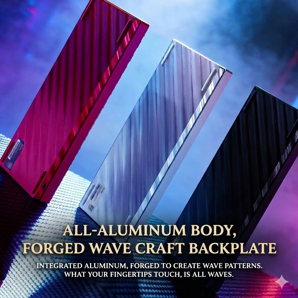 Thiết kế "Full Metal": Body hoàn thiện từ nhôm nguyên khối, mặt lưng được gia công họa tiết sóng nước (Forged Wave) cực kỳ sang chảnh và đầm tay.
