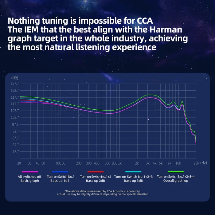 Cca Polaris IEM tuân thủ chặt chẽ tiêu chuẩn đồ thị Harman được tôn trọng, nó tóm tắt chất lượng âm thanh ưa thích của đa số người nghe, được biết đến với sự cân bằng âm sắc tự nhiên và được những người đam mê âm nhạc yêu thích rộng rãi. Giờ đây, thông qua Polaris, bạn có thể trải nghiệm mức độ chất lượng âm thanh tự nhiên chưa từng có như được xác định bởi biểu đồ Harman.