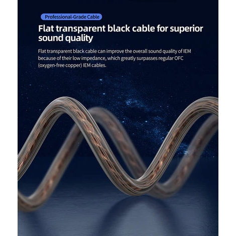 Cáp màu đen trong suốt phẳng không chỉ là một tuyên bố trực quan. Nó nâng cao đáng kể chất lượng âm thanh do trở kháng thấp, mang lại hiệu suất vượt trội so với cáp IEM OFC (đồng không oxy) thông thường.