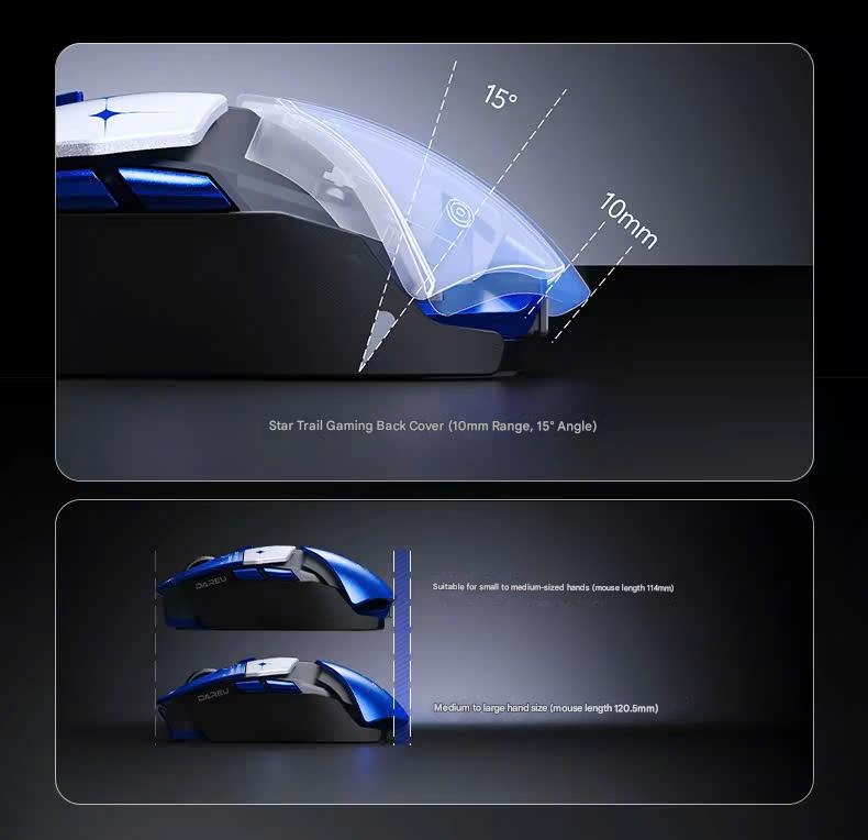 Module lưng "Star Orbit": Cho phép điều chỉnh độ dài thêm 10mm và góc nghiêng 15°, giúp chuột "biến hình" để phù hợp với cả người tay nhỏ (114mm) lẫn tay to (120.5mm). Dù bạn cầm kiểu Palm, Claw hay Fingertip, Ultra 07 đều cân được hết.