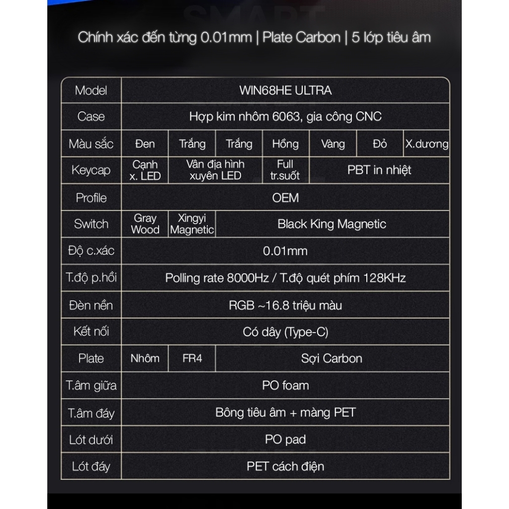 PHÍM CƠ GAMING WIN68 HE ULTRA - NHÔM CNC HIỆU NĂNG CAO🔥 Sau sự thành công của WIN60/WIN68 series, Aula đã nâng cấp lên phiên bản ULTRA với thiết kế nhôm CNC và nâng cấp hiệu năng. ============================= ✅THÔNG SỐ KỸ THUẬT - Phím Rapid Trigger HE 1 mode. - Case nhôm CNC nguyên khối. - Polling rate 8K, 128K scan rate. - RT 0,01mm, delay thấp 0,125ms. - Led RGB. - Full foam. - Chỉnh thông số bằng hub web. - Switch Graywood/XingYi/Black Emperor. https://cf.shopee.vn/file/vn-11134208-7ras8-mdipr7kkzq2926https://cf.shopee.vn/file/vn-11134208-7ras8-mdipr7kl2j75aahttps://cf.shopee.vn/file/vn-11134208-7ras8-mdipr7kl3xrl9chttps://cf.shopee.vn/file/vn-11134208-7ras8-mdipr7kl5cc1c1https://cf.shopee.vn/file/vn-11134208-7ras8-mdipr7kl6qwhd4https://cf.shopee.vn/file/vn-11134208-7ras8-mdipr7kl85gx2bhttps://cf.shopee.vn/file/vn-11134208-7ras8-mdipr7kl9k1dd9https://cf.shopee.vn/file/vn-11134208-7ras8-mdipr7klaylte7https://cf.shopee.vn/file/vn-11134208-7ras8-mdipr7klcd69bahttps://cf.shopee.vn/file/vn-11134208-7ras8-mdipr7kldrqp98
