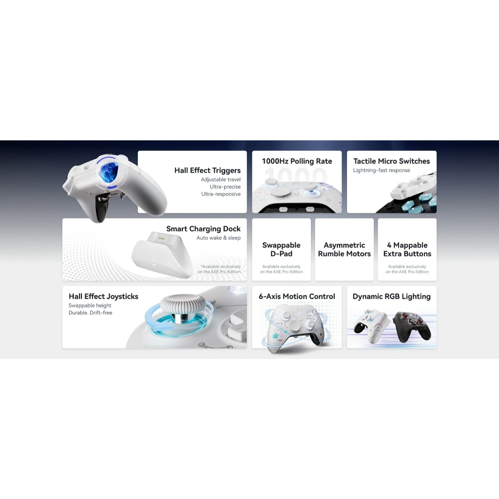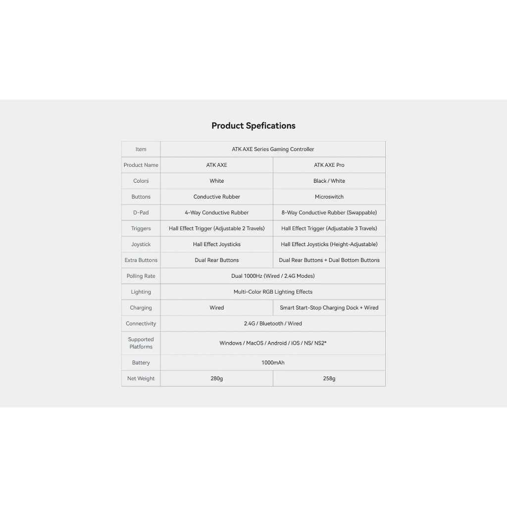 Tay Cầm chơi game Không Dây ATK AXE Series | Hall Joystick | XBOX Trigger | Dock Sạc | 3 Mode ‼️Thông tin sản phẩm: Kết nối: 3 mode Wired/Wireless/bluetooth Polling rate: 1000hz (Wired/Wireless) Hỗ trợ: Windows / macOS / Android / iOS / Nintendo Switch / NS2 Pin: 1000mAh, Có Led RGB 🎮 ATK AXE (Trắng only) Nút bấm: Cao su D-Pad: 4 hướng (cao su) Trigger: Hall Effect Trigger 2 hành trình Joystick: Hall Effect Joysticks Nút phụ: 2 nút phía sau Sạc: Cắm dây/ Trọng lượng: 280g . 🎮 ATK AXE Pro (Trắng / đen) Nút bấm: Microswitch D-Pad: 8 hướng (cao su) Trigger: Hall Effect Trigger 3 hành trình Joystick: Hall Effect Joysticks điều chỉnh chiều cao Nút phụ: 2 nút phía sau + 2 nút phía dưới Sạc: Dock sạc + có dây / Trọng lượng: 258g https://cf.shopee.vn/file/vn-11134208-820l4-mf0gbzks0weibb https://cf.shopee.vn/file/vn-11134208-820l4-mf0gbzkvf3t9fchttps://cf.shopee.vn/file/vn-11134208-820l4-mf0gbzkvgidp41https://cf.shopee.vn/file/vn-11134208-820l4-mf0gbzkvhwy568https://cf.shopee.vn/file/vn-11134208-820l4-mf0gbzkvjbil72https://cf.shopee.vn/file/vn-11134208-820l4-mf0gbzkvkq31d5https://cf.shopee.vn/file/vn-11134208-820l4-mf0gbzkvm4nhcbhttps://cf.shopee.vn/file/vn-11134208-820l4-mf0gbzkvnj7x45https://cf.shopee.vn/file/vn-11134208-820l4-mf0gbzkvoxsdefhttps://cf.shopee.vn/file/vn-11134208-820l4-mf0gbzkvqcct8fhttps://cf.shopee.vn/file/vn-11134208-820l4-mf0gbzkvrqx93ahttps://cf.shopee.vn/file/vn-11134208-820l4-mf0gd48p9ceg14 Lưu ý: ✅CHẾ ĐỘ BẢO HÀNH • Bảo hành các lỗi của NSX như: liệt phím, không lên nguồn, ko sạc được pin ... • Bảo hành 1 tháng, bao test 7 ngày. • Không bảo hành các trường hợp: rơi vỡ, vào nước, mod mạch, cháy nổ, sạc bằng củ sạc điện thoại. * Lưu ý quan trọng - CHỈ SẠC BẰNG CÁCH GẮN VÀO MÁY TÍNH, KHÔNG DÙNG CỦ SẠC. - VUI LÒNG QUAY VIDEO UNNOX ĐỂ ĐƯỢC BẢO HÀNH. ✅CAM KẾT TỪ TTKEYBOARD • Hàng được kiểm tra kĩ trước khi gửi đến tay khách hàng. • Sản phầm giống hình ảnh kích thước mô tả. #atk #ttkeyboard #taycam #xbox #controller #axe