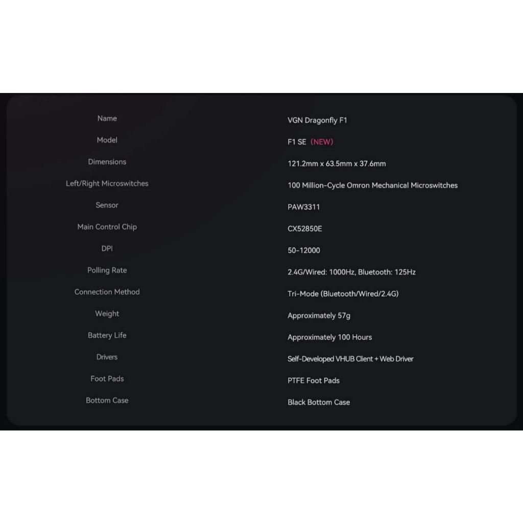 - Polling rate: 2.4Ghz/Wired 1000Hz, Bluetooth 125Hz.